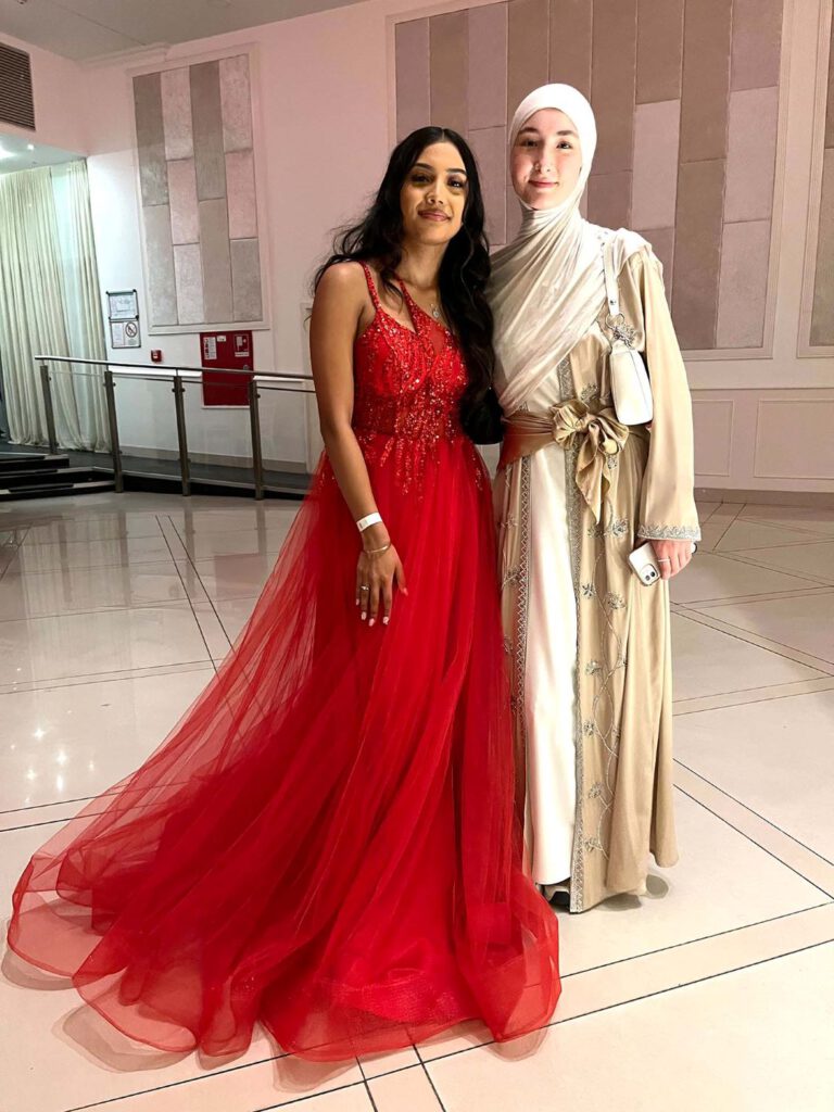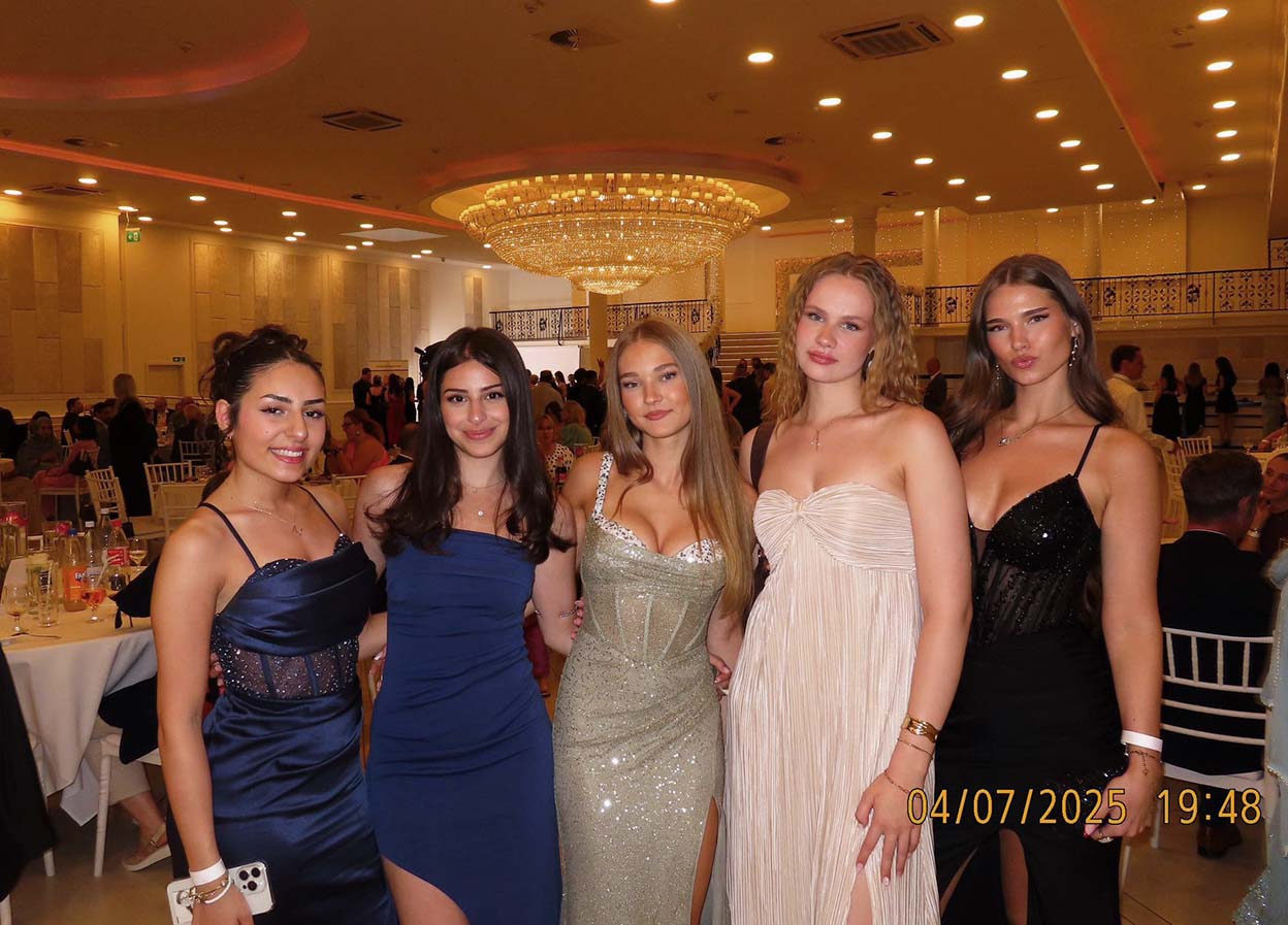 Der Abend begann mit einem stimmungsvollen Einlauf und großem Applaus, gefolgt von Gratulationen und ausgiebigen Fotoshootings – die Abendkleider und Anzüge waren unglaublich! Moderiert von David und Diyar präsentierte das Abiballkomitee ein unterhaltsames Programm – darunter Rankings wie „Zuspätkommer“, „TikTok-Star“ oder „Erfolgreich in 10 Jahren“. Nach einem Quiz „Lehrer:innen vs. Schüler:innen“ wurde das vielfältige internationale Buffet eröffnet – so lecker wie auf keinem Abiball zuvor (so die Lehrkräfte).
