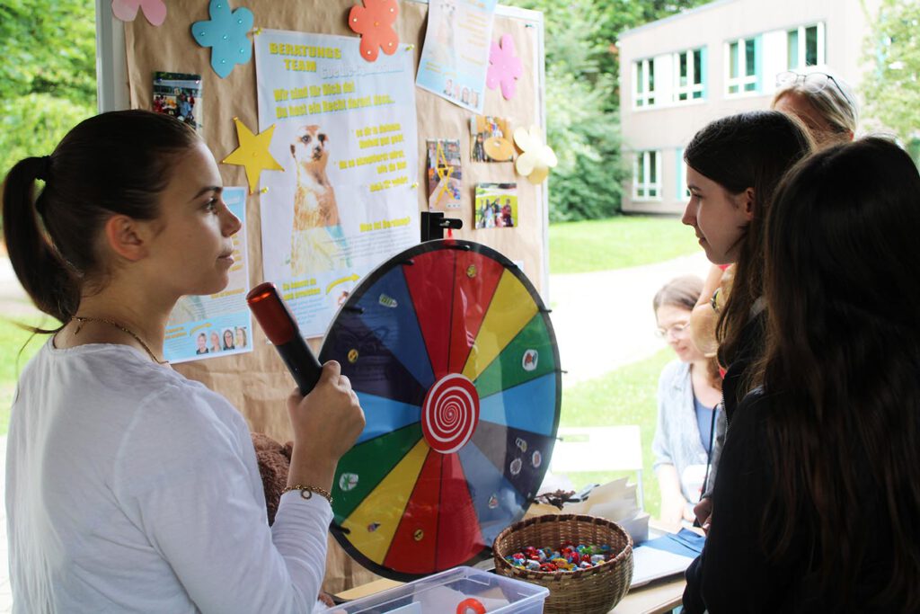 Montag, den 21. Juli 2025: Toni, das Erdmännchen gehört jetzt zum Beratungsteam. Zu seiner Begrüßung durften alle Schüler:innen das Glücksrad drehen und sich bei spritziger Musik über tolle Gewinne freuen!