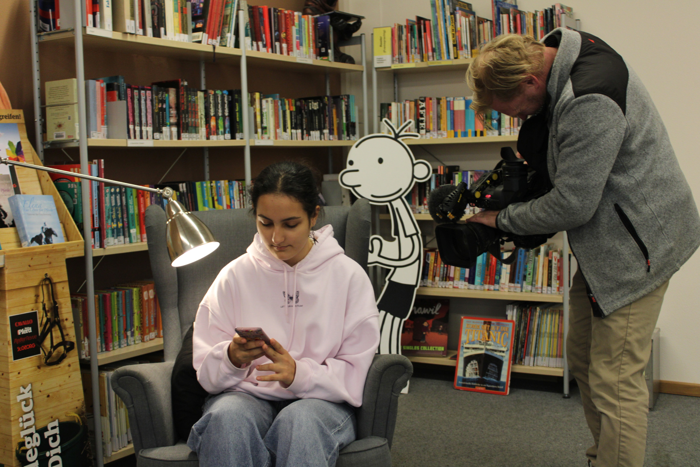 Mittwoch, 12. November 2025: Keine Sorge – die Fotos, die heute in unserer Schulbibliothek entstanden sind und auf denen einige Schüler:innen scheinbar intensiv mit ihren Handys beschäftigt sind, sind natürlich nur gestellt! Der Grund für die kleine Inszenierung: Das Fernsehteam des NDR war heute bei uns zu Besuch, um über das Thema „Handynutzung an Schulen“ zu berichten.