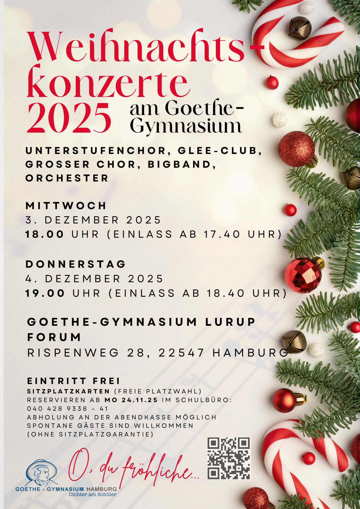 Donnerstag, den 13.11.2025: In wenigen Wochen ist es wieder soweit. Goethes Musikensembles lassen am 03. und 04. Dezember 2025 weihnachtliche Klänge im Forum erklingen. Kommt zahlreich vorbei, der Eintritt ist frei 🙂 Reserviert euch aber bitte rechtzeitig Karten für die begehrten Sitzplätze!