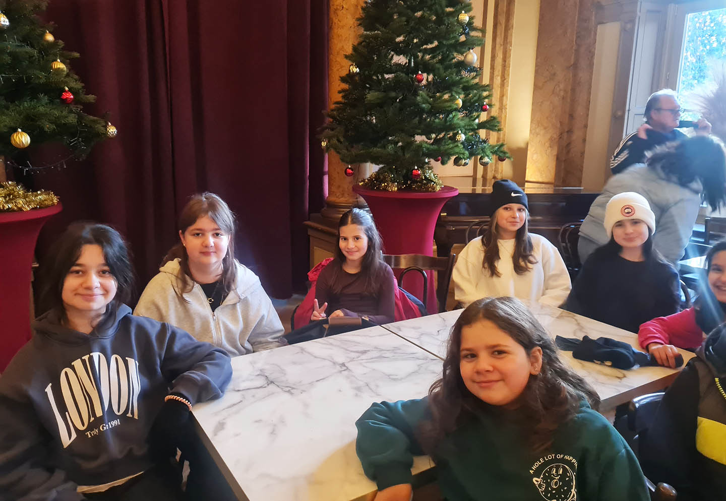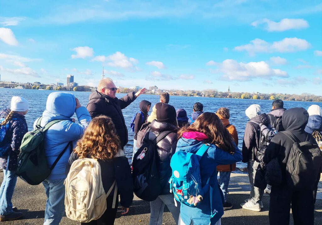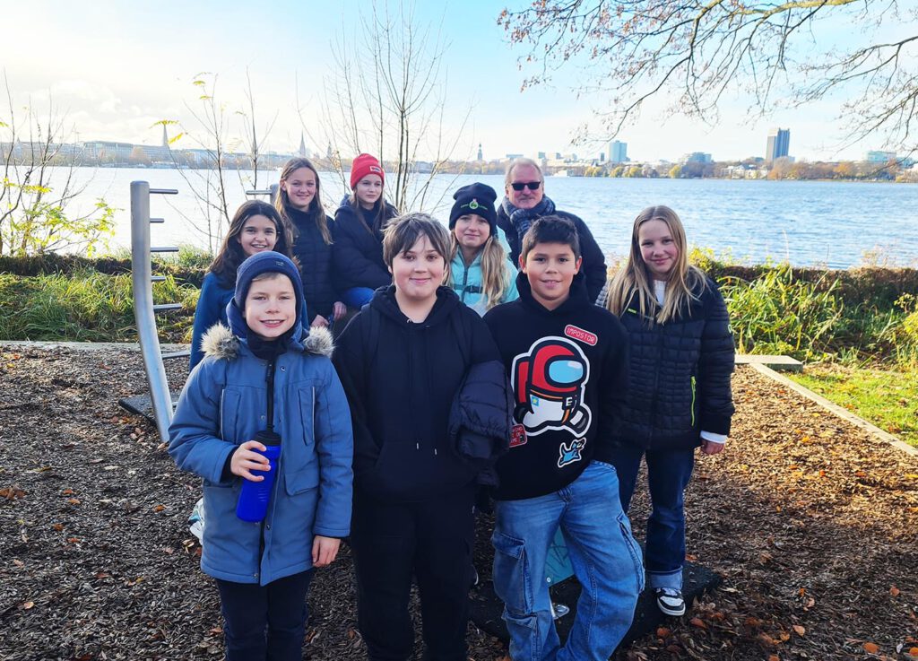 Montag, den 17. November 2025: Herr Zuber-Goos hatte für die Lesung “Aristide Ledoux – Meisterdieb wider Willen” das beste Wetter für seine Klasse 6b bestellt. Ein wundervoller Herbsttag und im Literaturhaus erwartete uns ein schon mit Tannenbäumen geschmückter Ballsaal. Frank Maria Reifenberg ist für uns extra aus Köln angereist und präsentiert seine Graphic Novel, die ganz passend zu dem Überfall im Louvre in Paris spielt. Mit uns begibt er sich dann auf die unterirdischen Katakomben der Stadt, die sehr unheimlich sind, aber auch gute Schlupflöcher bieten. Danke an Frau Schramm, die extra für uns ihren Ausflug zur Kinderbuchmesse nach Oldenburg verschoben hat, um mit uns zur Lesung zu gehen und an der Alster zu toben.