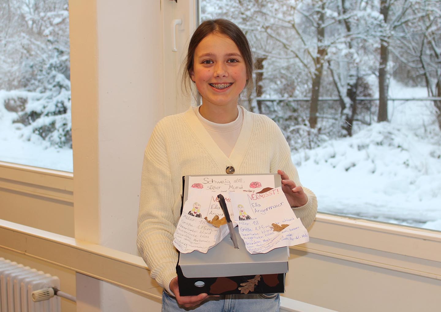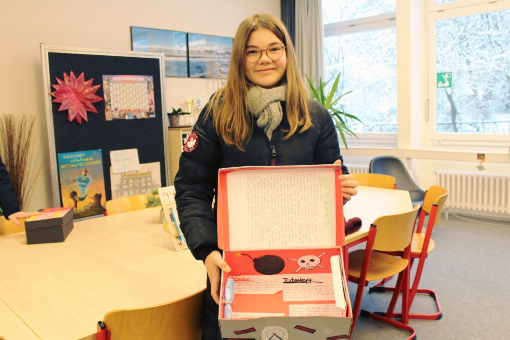 Montag, den 5. Januar 2026: Seit heute gibt es in unserer Schulbibliothek etwas ganz Besonderes zu entdecken: Die Klasse 7c hat im Deutschunterricht von Frau Reif mit viel Kreativität sogenannte Lesekisten zu ihrer individuellen Lektüre gestaltet – und die können sich sehen lassen! Hier im Foto seht ihr Lilli mit ihrer Kreativkiste zu Janet Clarks Thriller “Schweig still, süßer Mund”.