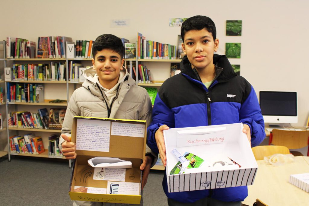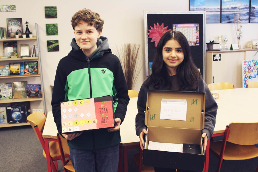 Statt ein Buch nur zu lesen und Fragen bei Antolin zu beantworten, entwickelten die Schüler:innen ihre ganz persönliche Buchkiste. Darin finden sich nicht nur eine Inhaltsangabe und eine Buchempfehlung, sondern auch drei Gegenstände, die im Roman eine wichtige Rolle spielen, sowie weitere kurze Texte rund um das jeweilige Buch. Lesen zum echten Anfassen.