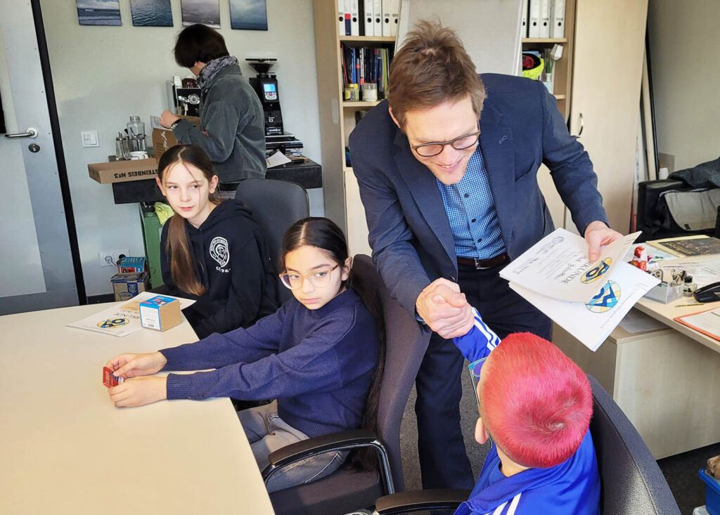 Zusätzlich erhielten alle sechs Kinder ein kleines vom Schulverein finanziertes Mathe-Knobel-Spiel sowie einen großen Applaus bei der Rückkehr in ihre Klassen. Nicht zu verachten ist natürlich auch die Freikarte für die nächste lange Nacht der Mathematik: Alle Teilnehmenden der Landesrunde haben sich automatisch für diese qualifiziert.