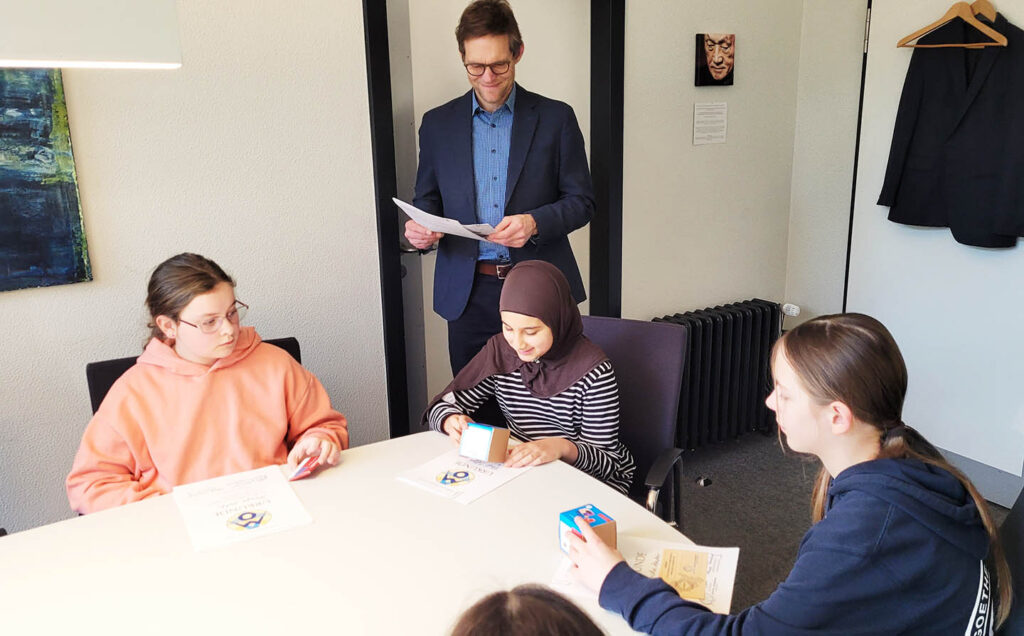Am Freitag, den 16. Januar 2026, waren sechs Fünft- und Sechstklässler kurzzeitig von ihrem Unterricht befreit und standen aufgeregt vor dem Büro des Schulleiters Frank Scherler. Dorthin waren sie eingeladen worden, um persönlich ihre Urkunden der zweiten Runde der diesjährigen Mathematikolympiade entgegenzunehmen. Sie alle hatten deutlich mehr als die Hälfte der zu vergebenen Punkte erreicht, was von Frau Reif, der Fachvertreterin Mathematik, als ganz besondere Leistung gewürdigt wurde. Vier Schülerinnen und Schüler sind sogar im Februar zur Landesrunde im Christianeum eingeladen: Mik Günther (5d) und Finn Strohmaier (6a) erreichten aufgrund ihrer überragenden Punktzahlen einen ersten Platz, Elif Oflaz (6d) und Franziska Reuter (6e) einen zweiten. Aber auch Leonard Füchsel und Ronja Nehls (beide 5e) und Tarana Wafa (6e) strahlten, als ihnen ihre Urkunden für einen dritten Platz überreicht wurden. Zusätzlich erhielten alle sechs Kinder ein kleines vom Schulverein finanziertes Mathe-Knobel-Spiel sowie einen großen Applaus bei der Rückkehr in ihre Klassen. Nicht zu verachten ist natürlich auch die Freikarte für die nächste lange Nacht der Mathematik: Alle Teilnehmenden der Landesrunde haben sich automatisch für diese qualifiziert. So hat das Goethe-Gymnasium einmal wieder gezeigt: Mathe kann wirklich Spaß machen und sorgt für strahlende Gesichter! Text: Frau Reif / Fotos: Herr Jürgens