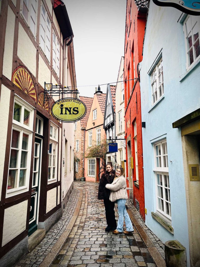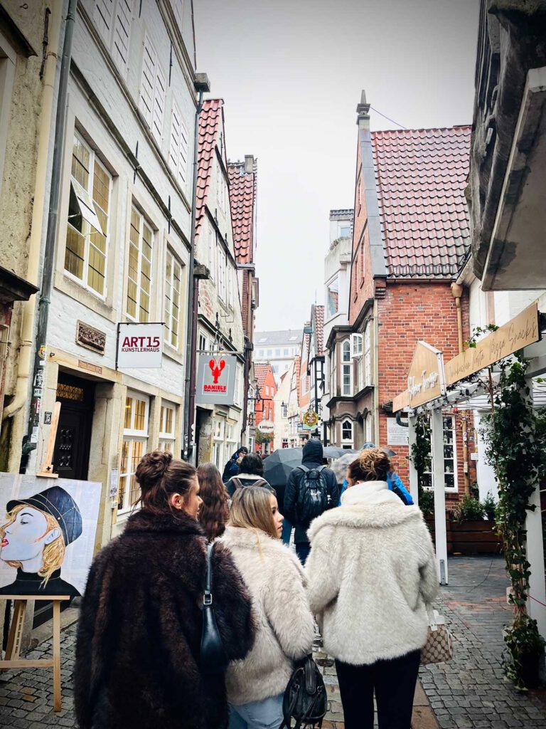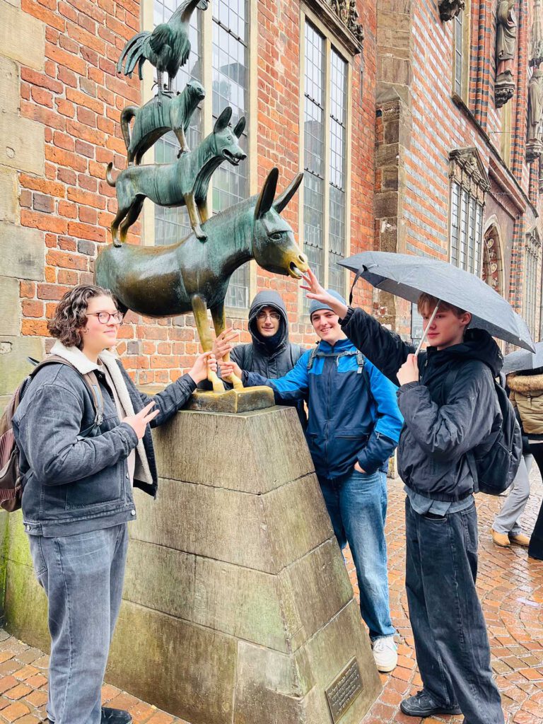 Nach der Weserburg, die auf einer Insel gelegen ist, ging es weiter über eine Brücke in die Bremer Innenstadt. In der Böttcherstraße bestaunten wir die beeindruckende Architektur und die kleinen, besonderen Läden. Auch das Schnoor-Viertel mit seinen engen Gassen durfte natürlich nicht fehlen. Dann kam der eigentliche Auftrag dieser Exkursion: bei der Bronzestatue der Bremer Stadtmusikanten neben dem Rathaus musste jede/r von uns die beiden Vorderbeide des Esels umfassen und seine Schnauze streicheln – denn das bringt bekanntlich großes Glück. Und das haben wir uns schon mal für unser Abi abgeholt – vielen Dank Bremen!