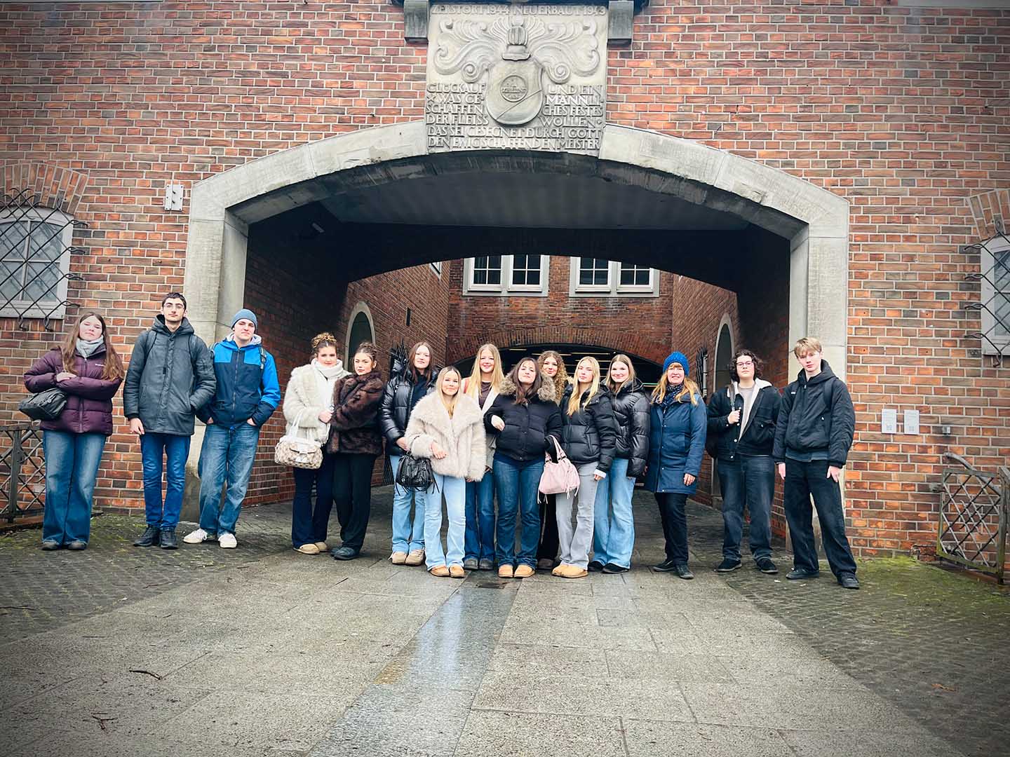 Am Mittwoch, den 11. Februar 2026 begab sich das Kunstprofil von Frau Götz nach Bremen in die Weserburg, ein Museum für moderne Kunst. Gemeinsam mit zwei Guides erkundeten wir die Ausstellung mit dem Titel „Cold as Ice – Kälte in Kunst und Gesellschaft“ und erfuhren spannende Hintergründe zu den Werken und ihrer Entstehung. Schnell wurde klar: Diese Ausstellung ist nichts für Warmduscher. Begriffe wie kalt, einsam und furchtlos beschrieben die Atmosphäre treffend. Sehr beeindruckt waren wir von einem Video, in dem ein Künstler auf dem Eis vor einem riesigen Eisbrechers entlang läuft. Jedes einzelne Werk setzte sich auf eigene Weise mit Gegensätzen wie Wärme und Kälte auseinander – emotional wie auch gesellschaftlich. Danach durften wir noch einen Blick in die Neusortierung der ständigen Sammlung werfen. Besonders überraschend: Wir begegneten sogar Goethe – samt „Haustier“! Ein Künstler hatte in das berühmte Goethe-Portrait von Johann Tischbein den bekannten Hasen von Albrecht Dürer integriert… Nach der Weserburg, die auf einer Insel gelegen ist, ging es weiter über eine Brücke in die Bremer Innenstadt. In der Böttcherstraße bestaunten wir die beeindruckende Architektur und die kleinen, besonderen Läden. Auch das Schnoor-Viertel mit seinen engen Gassen durfte natürlich nicht fehlen. Dann kam der eigentliche Auftrag dieser Exkursion: bei der Bronzestatue der Bremer Stadtmusikanten neben dem Rathaus musste jede/r von uns die beiden Vorderbeide des Esels umfassen und seine Schnauze streicheln – denn das bringt bekanntlich großes Glück. Und das haben wir uns schon mal für unser Abi abgeholt – vielen Dank Bremen!