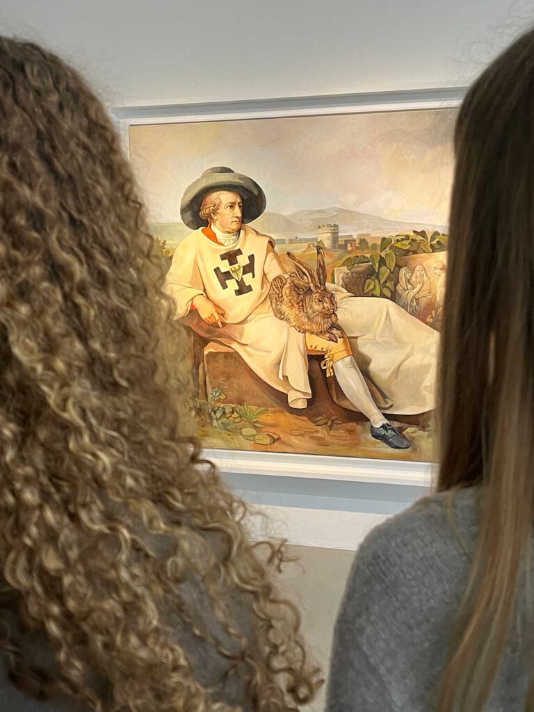 Danach durften wir noch einen Blick in die Neusortierung der ständigen Sammlung werfen. Besonders überraschend: Wir begegneten sogar Goethe – samt „Haustier“! Ein Künstler hatte in das berühmte Goethe-Portrait von Johann Tischbein den bekannten Hasen von Albrecht Dürer integriert…