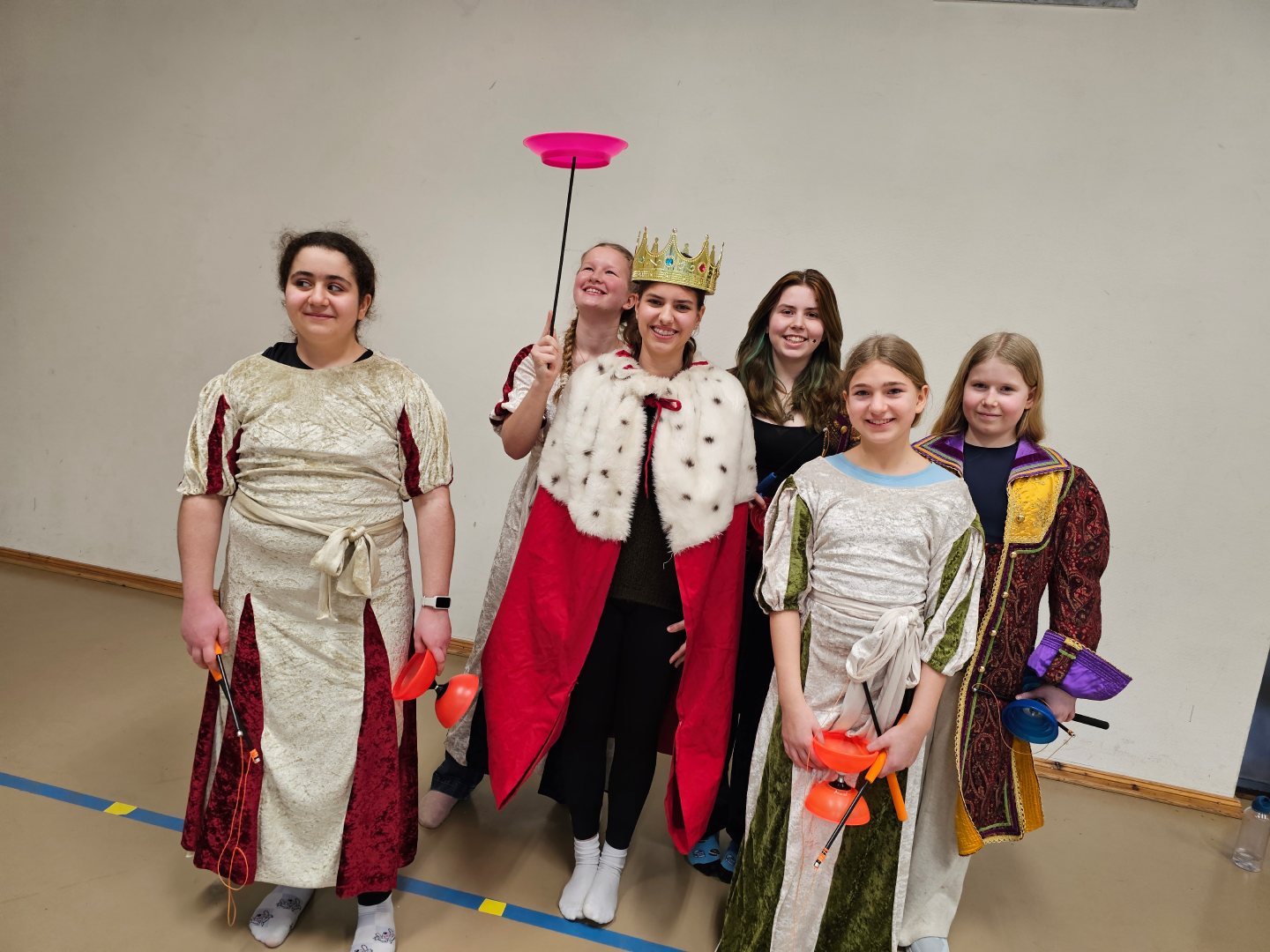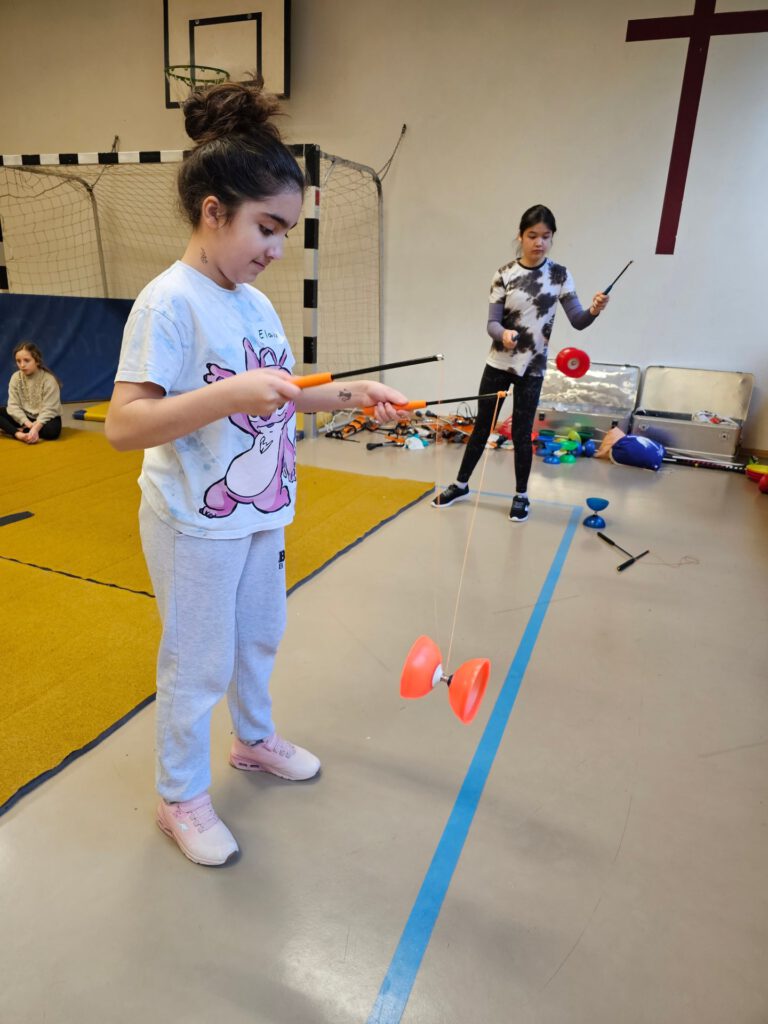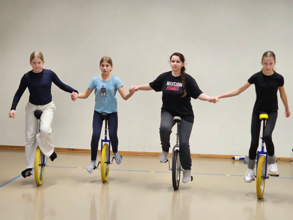 Nachdem das Material ausgeladen und das Gelände erkundet worden war, durften auch die Zimmer bezogen werden und bald schon konnten die Proben beginnen. Es wurde gespielt, gesungen und gelacht, jongliert, Einrad gefahren, Kugel gelaufen, sich gegenseitig unterstützt, Text geprobt, gemeinsam gegessen und kreativ gearbeitet. Während Benthe und Lille die Einradnummer mit den Zirkusmenschen einstudierten, überlegten Svielen und Sixten mit dem Unterstufenchor, welche Bewegungen zu den Musikstücken passen könnten. Herr Lenz spielte Gitarre zur Klaviermusik von Frau Wiechmann und Frau Haddorp übte die Schwarzlichtnummer mit dem Zirkuskurs.