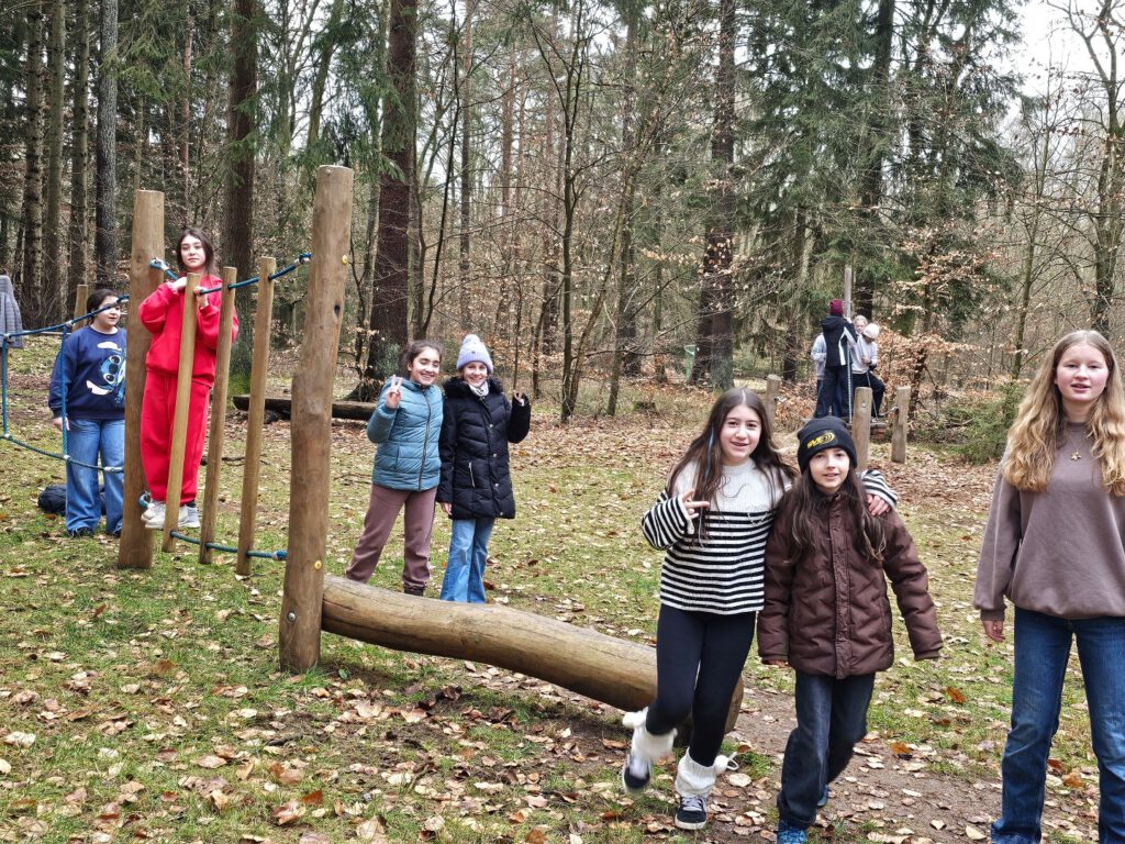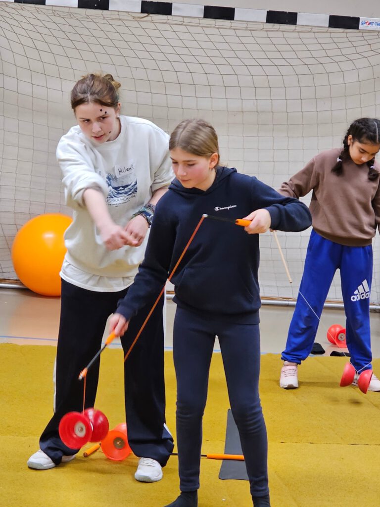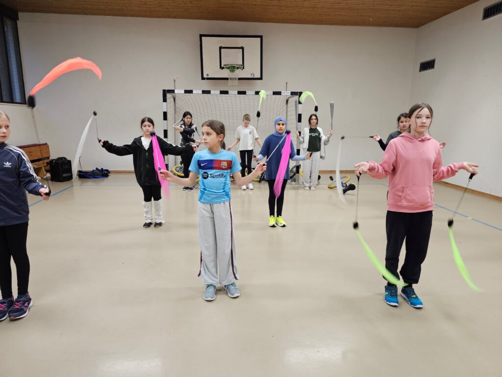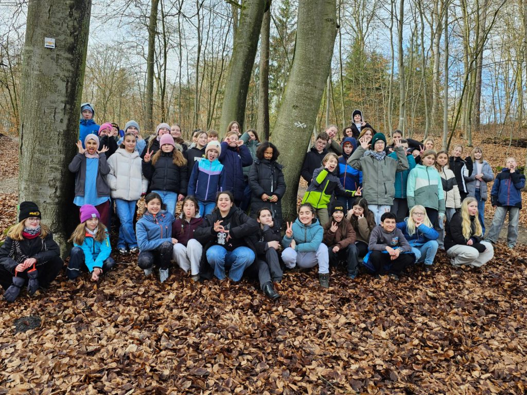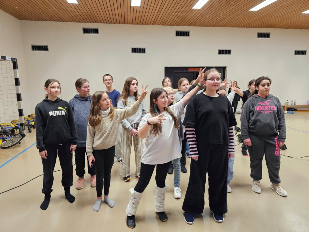 Montag, den 23. Februar 2026: In diesem Jahr trafen sich die 47 Teilnehmer:innen der Probenreise für das Musical des Unterstufenchors und des Zirkuskurses an den Arenen, da wir ausnahmsweise mit dem Bus nach Mölln gereist sind. Durch die Bauarbeiten auf der Berlinstrecke fuhren in diesem Jahr keine Züge nach Mölln und nur dank der finanziellen Unterstützung des Schulvereins, der ausnahmsweise die Buskosten übernommen hat, konnte die Reise überhaupt stattfinden. Unterstützt von Lille, Svielen und Sixten aus der 10. Klasse sowie Benthe machten sich Frau Wiechmann, Frau Bornmüller und Frau Haddorp auf den Weg. Herr Lenz war mit dem Hänger und dem Zirkusmaterial schon früher gestartet und gegen 11:00 Uhr war dann auch der Bus vor Ort. Nachdem das Material ausgeladen und das Gelände erkundet worden war, durften auch die Zimmer bezogen werden und bald schon konnten die Proben beginnen. Es wurde gespielt, gesungen und gelacht, jongliert, Einrad gefahren, Kugel gelaufen, sich gegenseitig unterstützt, Text geprobt, gemeinsam gegessen und kreativ gearbeitet. Während Benthe und Lille die Einradnummer mit den Zirkusmenschen einstudierten, überlegten Svielen und Sixten mit dem Unterstufenchor, welche Bewegungen zu den Musikstücken passen könnten. Herr Lenz spielte Gitarre zur Klaviermusik von Frau Wiechmann und Frau Haddorp übte die Schwarzlichtnummer mit dem Zirkuskurs. In diesem Jahr wird sich das Musical auf die Spuren der Demokratie begeben und in einer Zeitreise durch die Geschichte unterwegs sein. Dank der Unterstützung von Frau Bornmüller konnten alle bald die Tanzschritte zu den Klängen von Beyoncé und wussten, dass es in dem Lied um die Frauenbewegung geht. Neben den Proben versorgten Svielen und Sixten die Gruppe auch mit einer Zimmeraufgabe, in der es um den künstlerischen Umgang mit bestimmten Begriffen wie Aura und Anhängerkupplung ging. Bei der Präsentation wurde gestaunt, gelacht und noch mehr applaudiert angesichts der Höchstleistungen, zu denen die Zimmerbewohner:innen aufliefen. Über allem schwebte aber stets die Frage: ‚Was verbirgt sich unter der Mütze von Sixten?‘ Gekoppelt an eine Wette wurde das Rätsel dann am letzten Morgen gelüftet – die Antwort ist auf dem Foto zu sehen! Erschöpft, aber glücklich machte sich die Gruppe dann am Mittwochmorgen auf den Rückweg und im Bus erklang immer wieder die Frage: ‚Wer mag Nudeln?‘ ‚Mahmed!‘