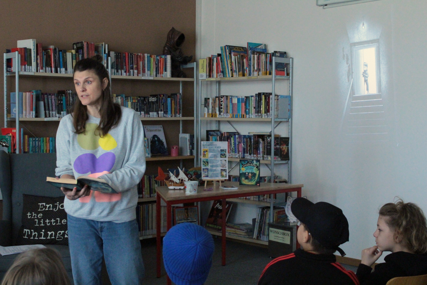 Mittwoch, den 18. März 2026: Und diese sind ausnahmsweise nicht zur Geisterstunde gekommen, sondern ganz prominent in der 3. und 4. Stunde der Klasse 5a mit Herrn Dührkop. Dafür hat Frau Schramm gesorgt, die die Autorin Tina Blase extra aus Ottensen an die Schule eingeladen hat, wo sie ihre Trilogie der „Geisterhelfer“ vorgestellt hat.