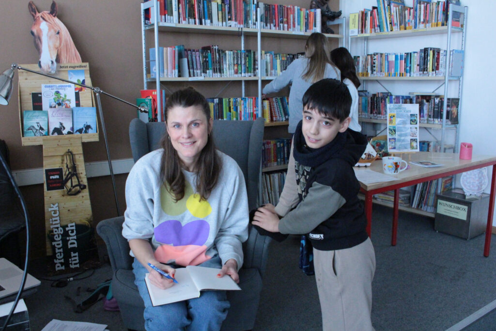 Mittwoch, den 18. März 2026: Und diese sind ausnahmsweise nicht zur Geisterstunde gekommen, sondern ganz prominent in der 3. und 4. Stunde der Klasse 5a mit Herrn Dührkop. Dafür hat Frau Schramm gesorgt, die die Autorin Tina Blase extra aus Ottensen an die Schule eingeladen hat, wo sie ihre Trilogie der „Geisterhelfer“ vorgestellt hat. Im Mittelpunkt der Geschichte steht Leo Helsing Krüger- Helsing wie der berühmte Vampirjäger, der Dracula nachstellt! Er ist ein schüchterner zehnjähriger Junge mit einer ganz besonderen Fähigkeit: Er kann Geister sehen und mit ihnen sprechen – ohne es zunächst zu wissen. Erst als er den Geistern Ferdinand, Agathe und Harry begegnet, erfährt er von seiner Gabe. Die drei brauchen dringend seine Hilfe, denn ihr Seelenfrieden ist in Gefahr: Ein übellauniger Quälgeist stört ihre Ruhe. Unsere Ruhe wurde nur von einem Laubbläser draußen gestört. Diesen überstimmten wir mit dem lauten Applaus für diese schaurig-schöne Lesung!!!!