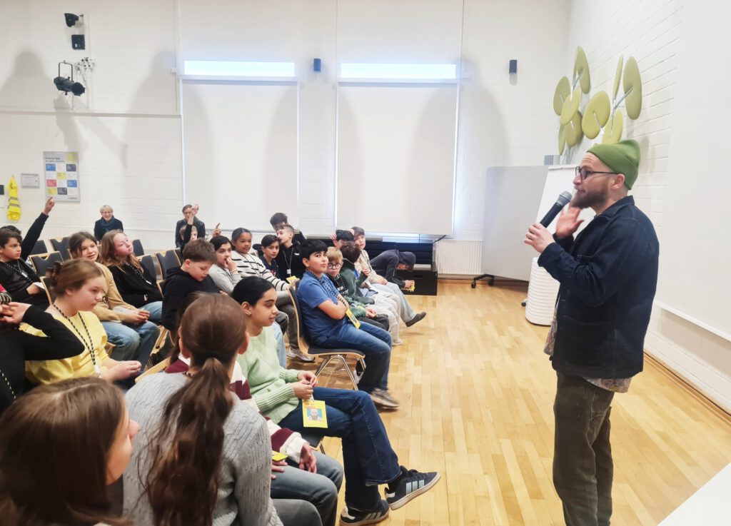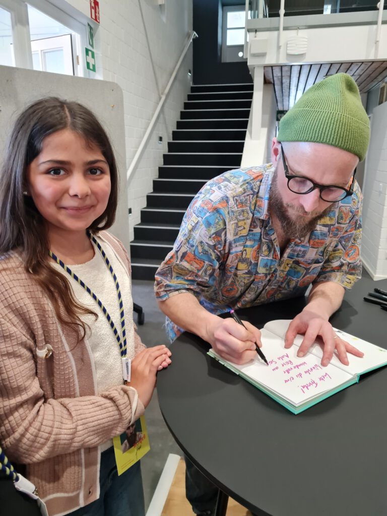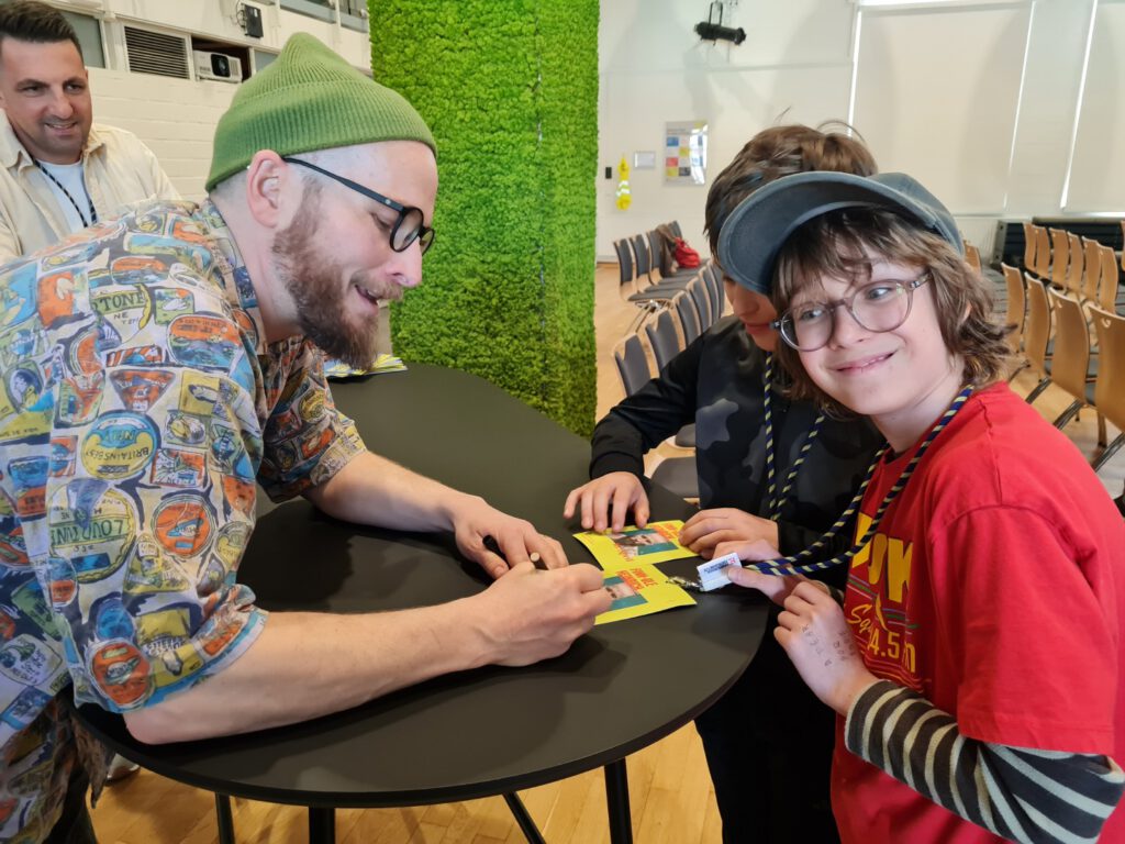 Er erzählte uns auch von seinem Verlag „Huckepack“, den er als Teil des mairisch-Verlages selbst gründete. Die Kinder fanden das Buch „Aali muss los“ sehr spannend. Es ging in diesem Buch um einen Aal, der sich innerlich und äußerlich änderte und sein altes Zuhause verließ. Was dann passierte, müsst ihr selbst in dem Buch nachlesen.