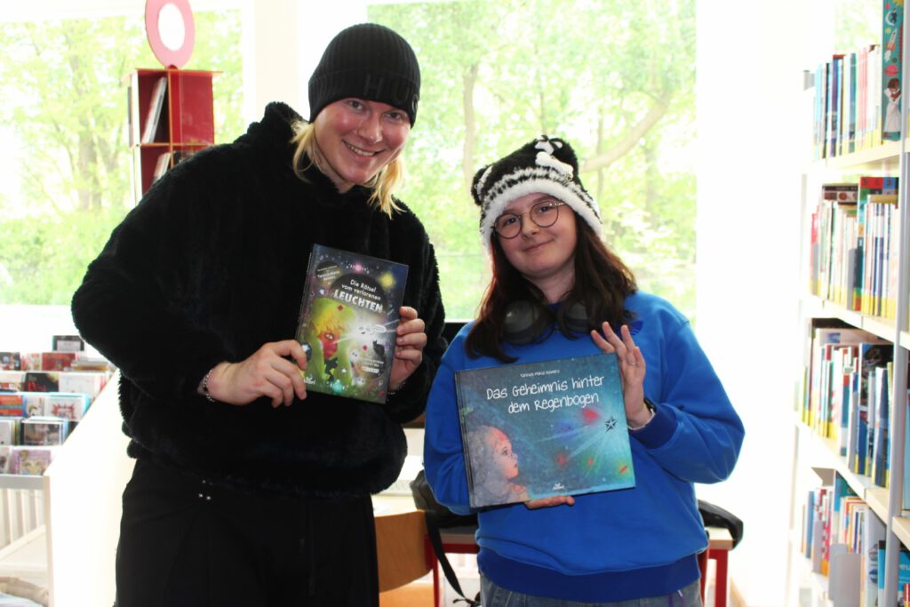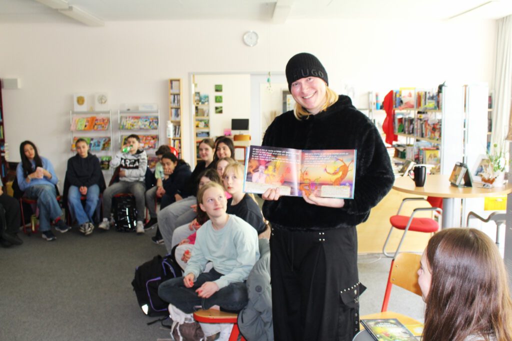 Montag, den 27. April 2026: Heute ist die Kinderbuchautor:in Yannick-Maria zu Gast bei Frau Wiechmanns Klasse 6c in der Schulbibliothek. Im obigen Foto seht ihr Yassin und Omed mit einer der Hauptfiguren Maxi, die so wie unser Klassenkamerad Maxi heißt. Und nicht nur das- beide teilen auch noch das Hobby des Gitarrenspiels! Sier berichtet, wie die Kunst in schwierigen, dunklen Zeiten geholfen hat, an das Gute zu glauben. Sier hat zwei Bücher geschrieben und selbst illustriert: „Das Geheimnis hinter dem Regenbogen“ und „Die Rätsel vom verlorenen Leuchten“. Mit diesen Geschichten macht sier Mut, die bunte Welt in sich selbst und auch im Außen zu entdecken. Yannick-Maria teilt persönliche Erfahrungen zu den Themen Liebe, Vielfalt und Identitätssuche. Sier erzählt, dass es manchmal gar nicht so eindeutig ist, ob sich ein Mensch als Junge oder Mädchen fühlt. Sier selbst möchte sich keinem Geschlecht zuordnen. Deshalb verwenden wir hier das Pronomen „sier“ – eine Mischung aus „sie“ und „er“, für Menschen, die sich nicht eindeutig einem Geschlecht zugehörig fühlen. Ein besonders berührender Moment: Ihr leider viel zu früh verstorbener Vater sagte einmal über sier: „Jetzt habe ich nicht nur einen wunderschönen Sohn, sondern auch eine wunderschöne Tochter.“