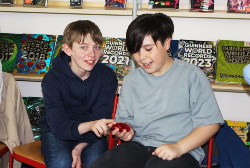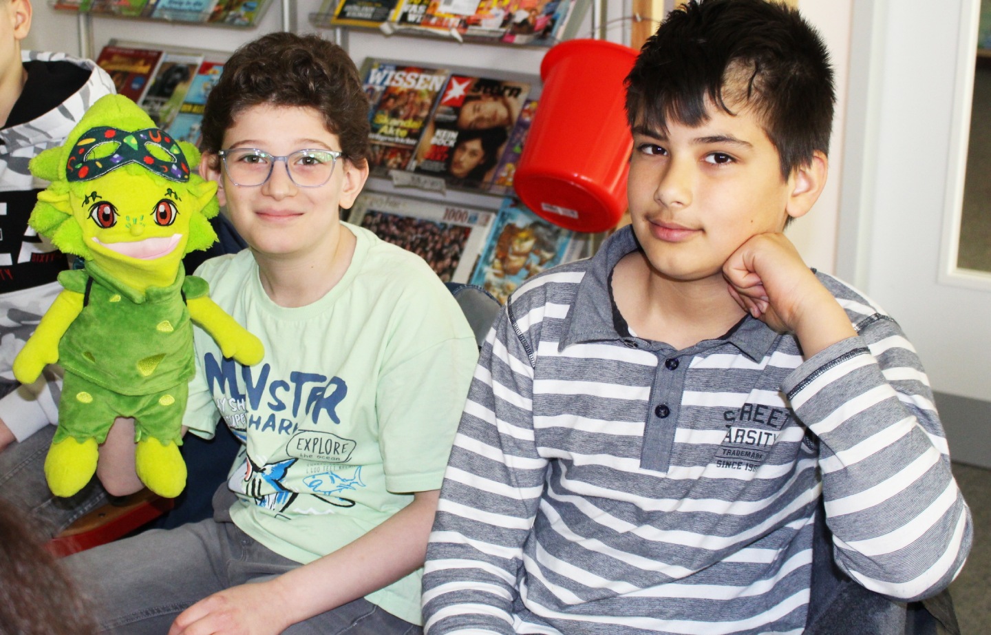Montag, den 27. April 2026: Heute ist die Kinderbuchautor:in Yannick-Maria zu Gast bei Frau Wiechmanns Klasse 6c in der Schulbibliothek. Im obigen Foto seht ihr Yassin und Omed mit einer der Hauptfiguren Maxi, die so wie unser Klassenkamerad Maxi heißt. Und nicht nur das- beide teilen auch noch das Hobby des Gitarrenspiels!