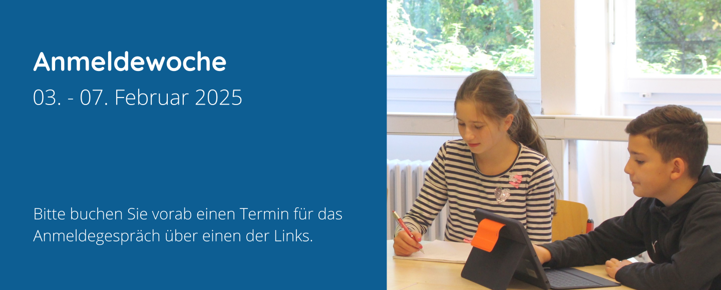 Während der Anmeldewoche im Februar 2026 können Sie Ihr Kind an unserer Schule anmelden, wenn es zum kommenden Schuljahr auf die weiterführende Schule wechselt. Bitte buchen Sie einen Termin für das Anmeldegespräch. Wählen Sie dazu entweder einen passenden Termin bei Person A oder Person B. Wir freuen uns auf Ihr Kind und Sie!