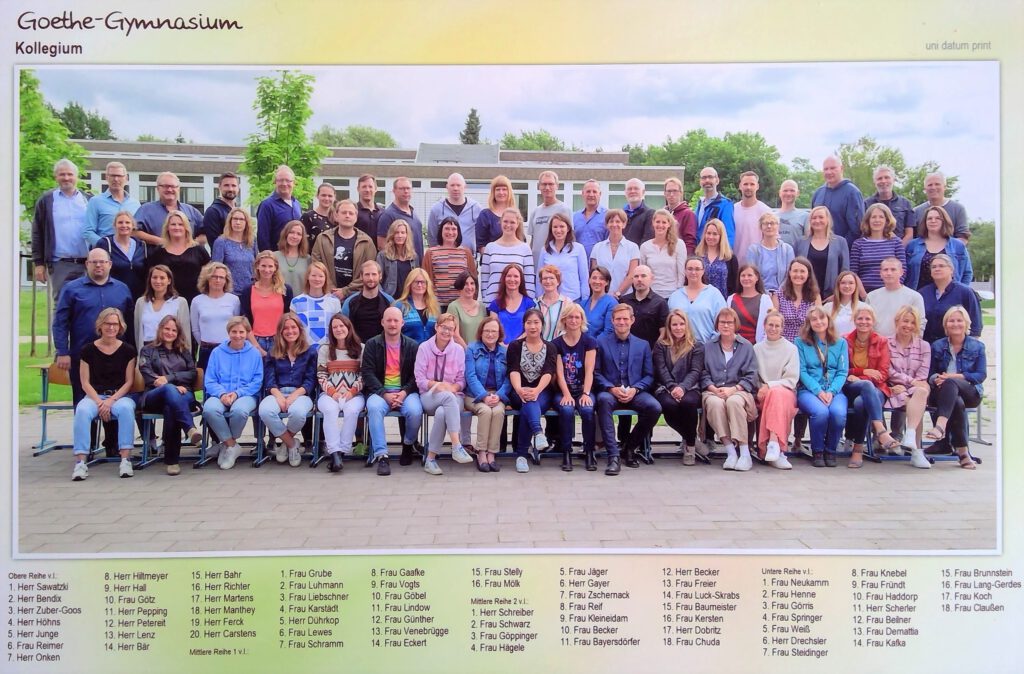 Am Goethe-Gymnasium arbeiten derzeit über 90 Personen. Neben den ca. 80 Lehrerinnen und Lehrer, den drei Sozialpädagoginnen plus einem Erzieher in Ausbildung und FSJlern, den drei Verwaltungsangestellten, dem Hausmeisterehepaar und einem Betriebsarbeiter sind über 40 Honorarkräfte bei uns im Ganztagesbetrieb tätig.